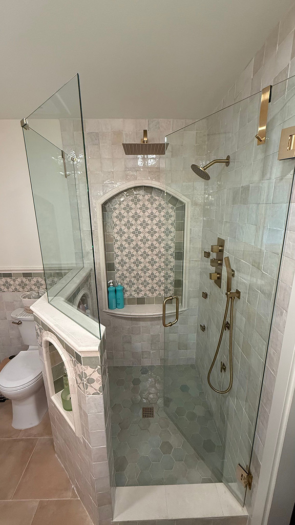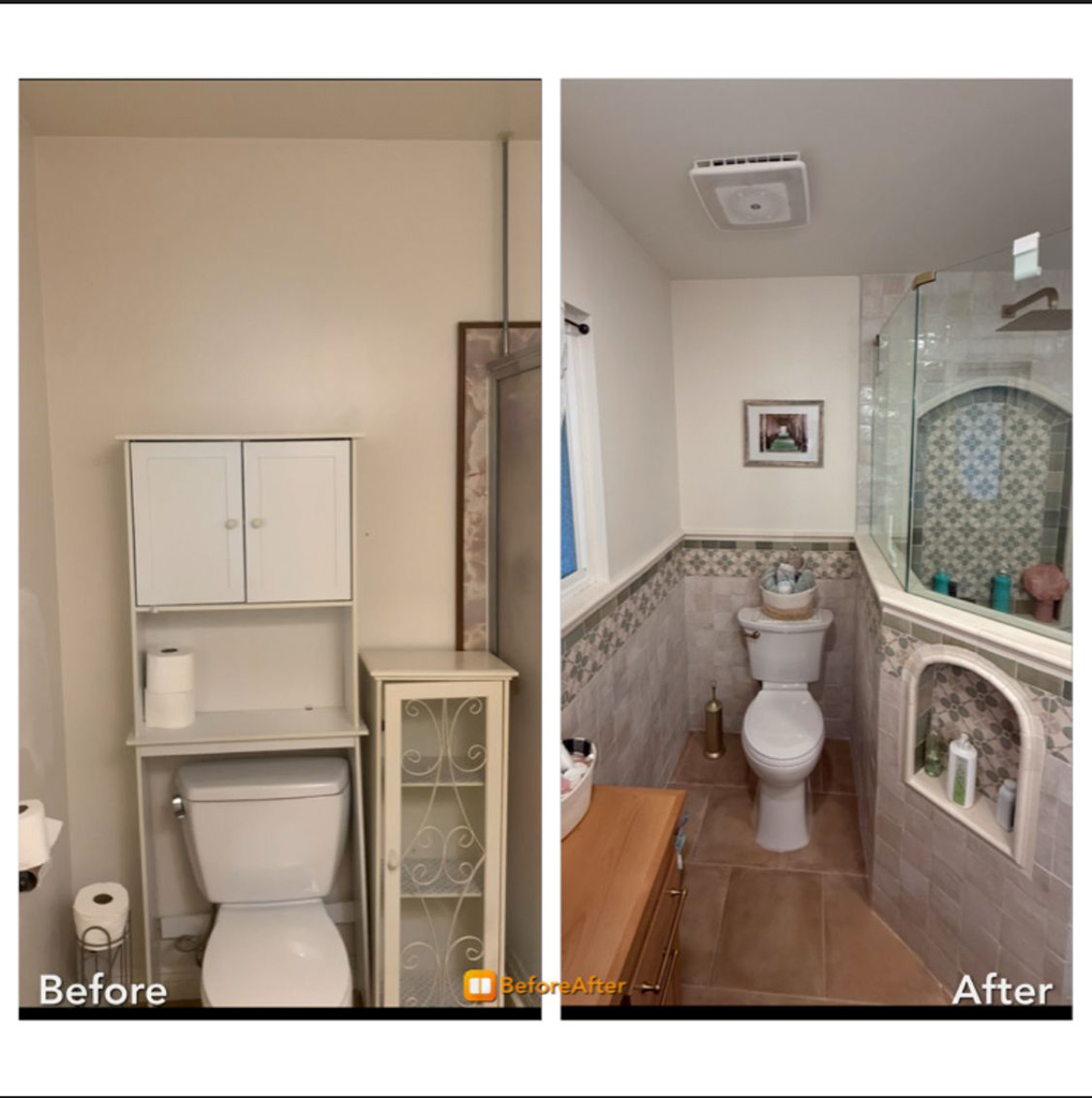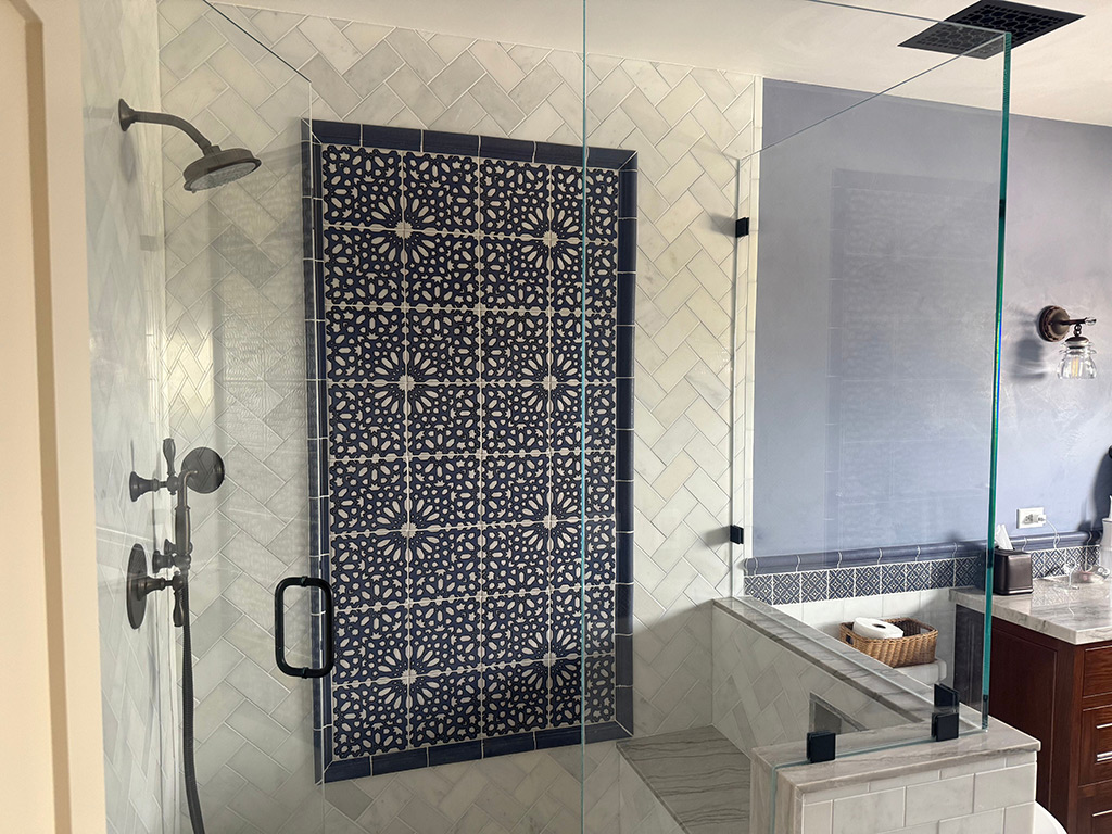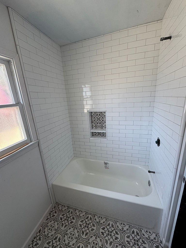 White tile walls from the top of the tub to the ceiling, with the floor tile pattern included as the backsplash for the inset shelf. The result is a gorgeous bathroom!