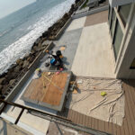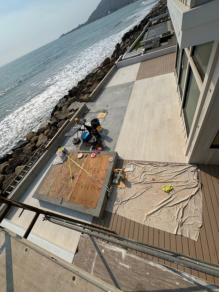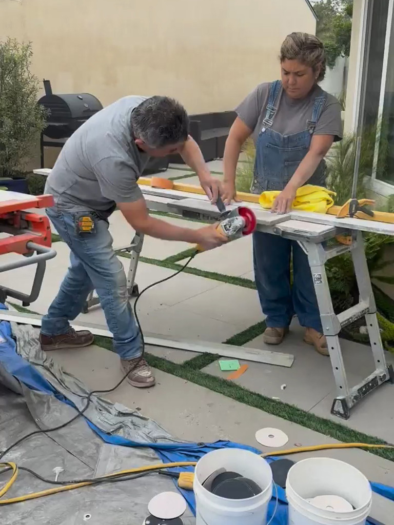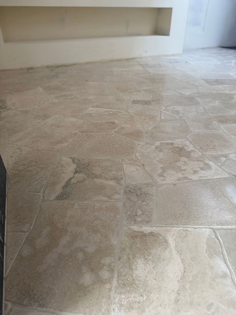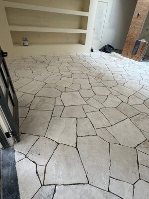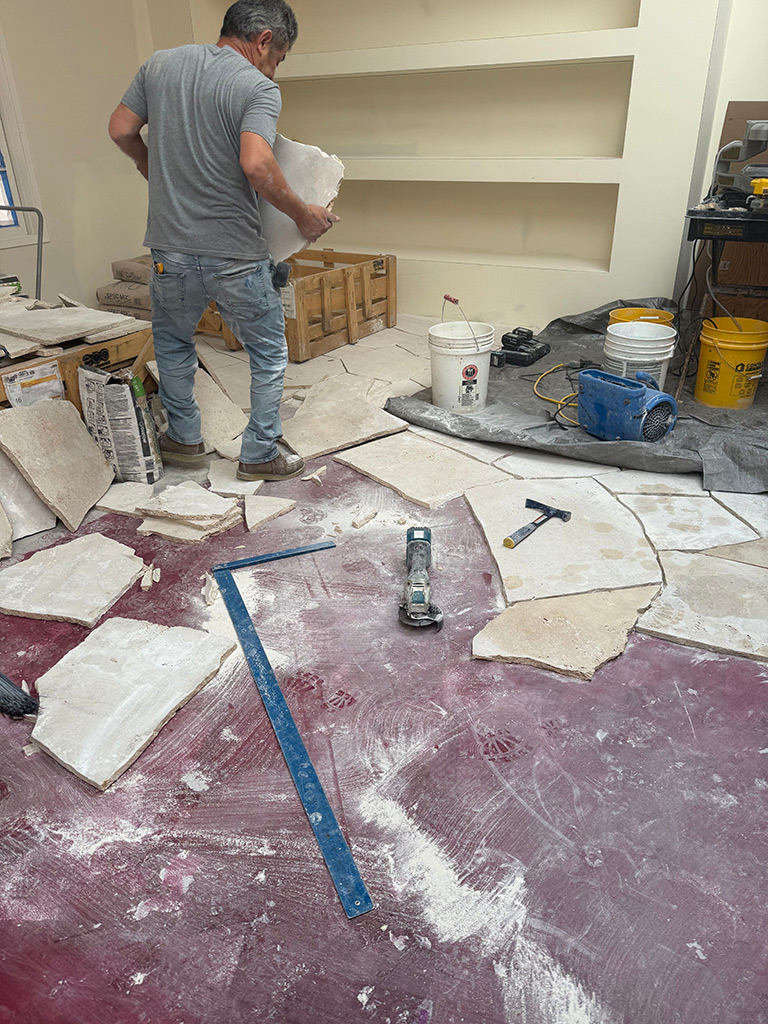 Click or tap to view larger images of our installers cutting flooring outside, and the progress of a residential stone floor installation: